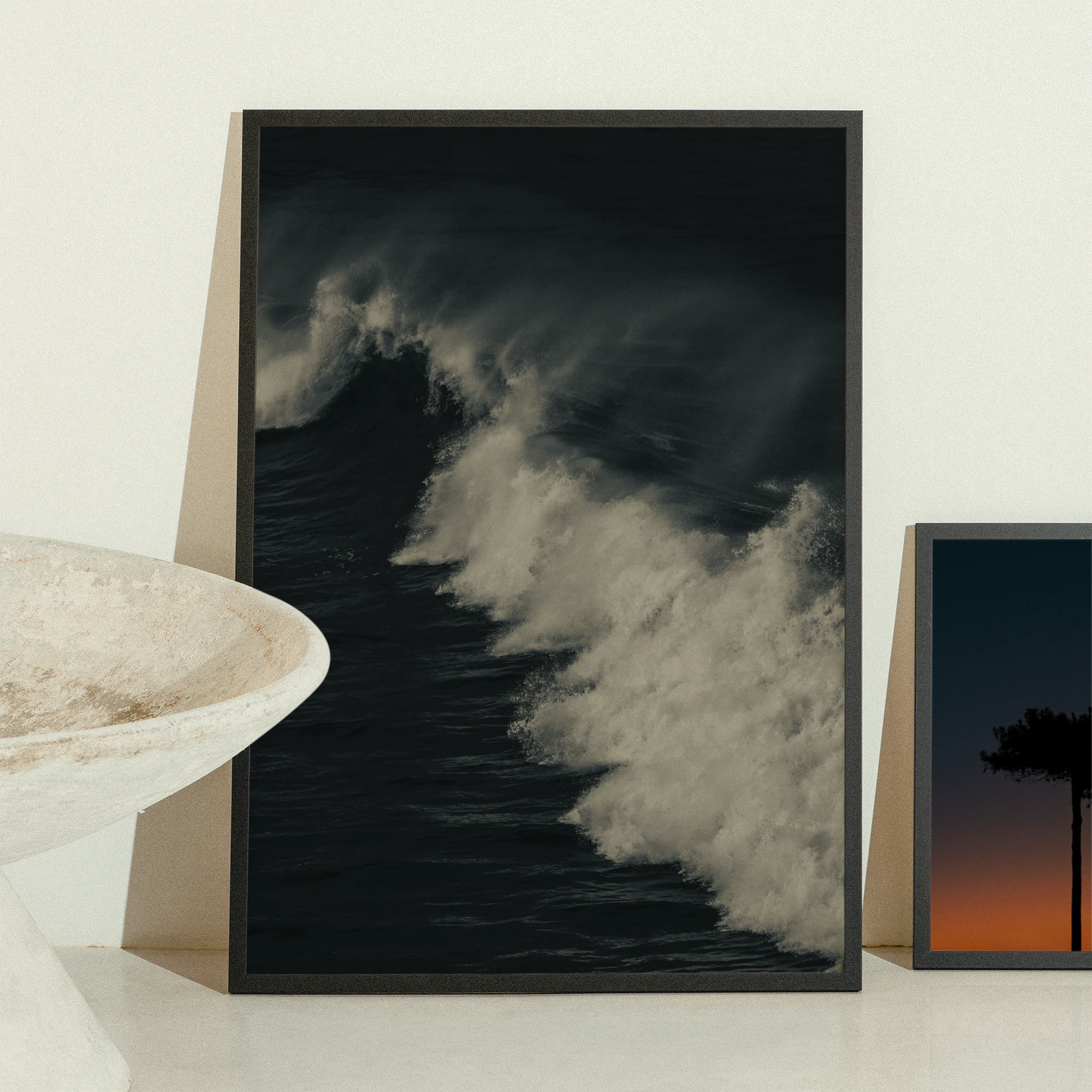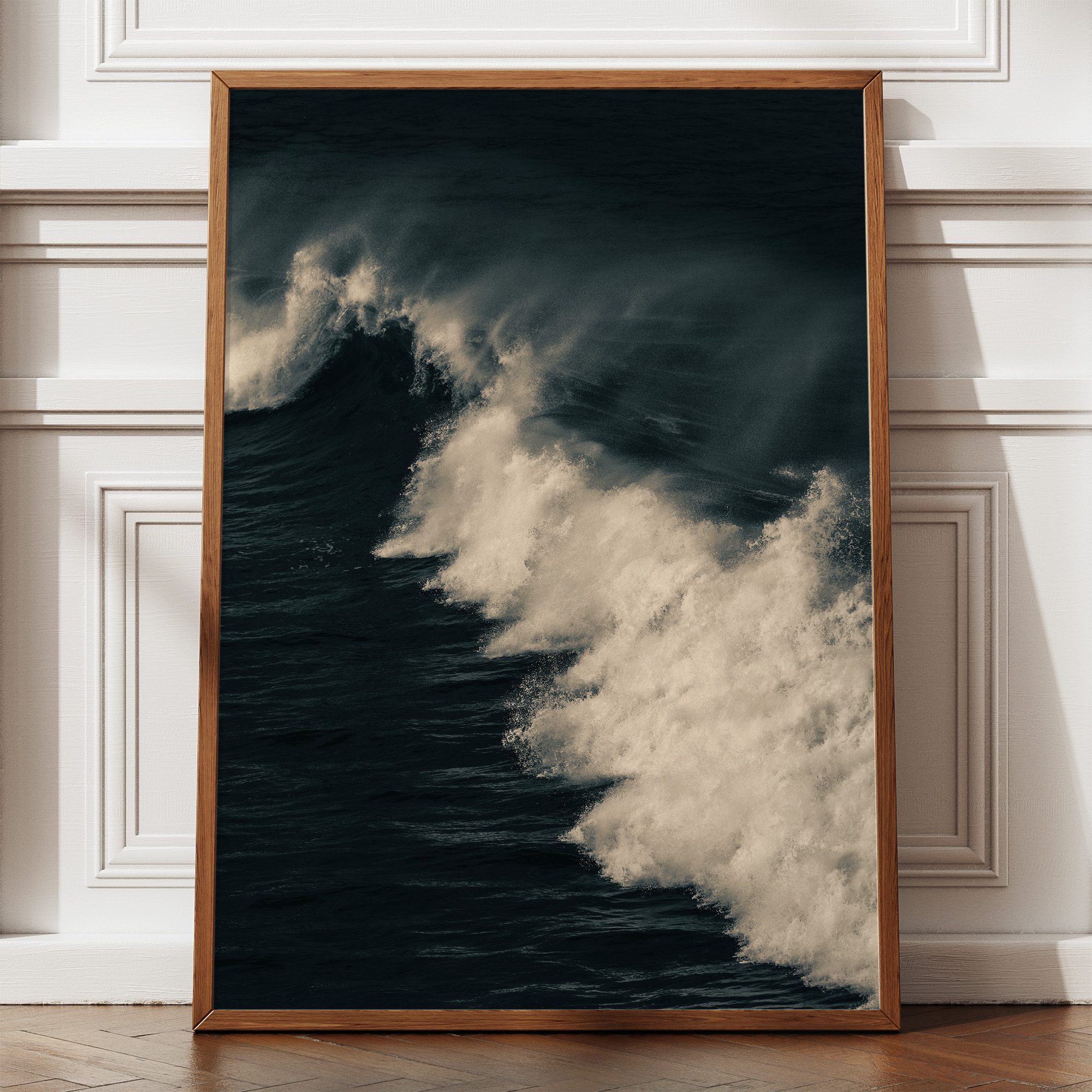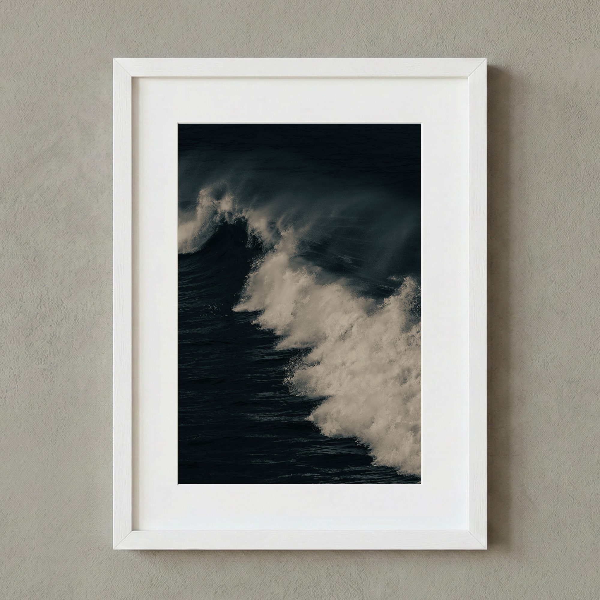 Si vous souhaitez magnifier le contraste et la dramaturgie de ce tirage, un cadre noir profond (mat ou satiné) est le choix par excellence pour cette œuvre. Le noir prolonge les tons sombres de l’océan et crée un écrin qui intensifie le contraste avec l’écume blanche. Cette option confère à l’image une présence puissante et contemporaine.